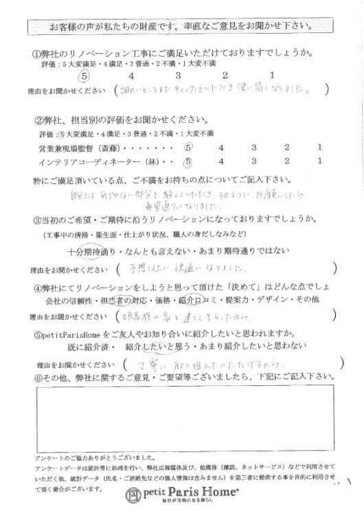 プチパリホームでは完成時にお客様アンケートを実施しております。