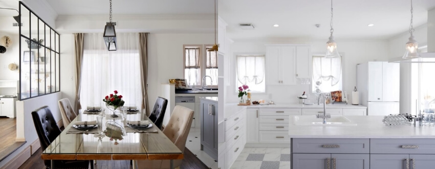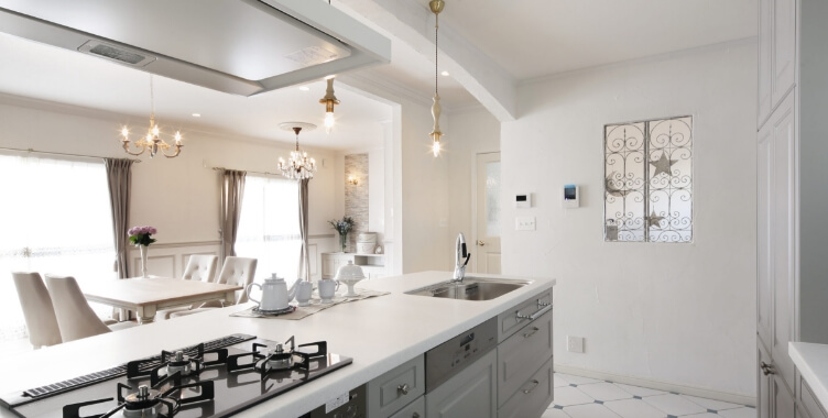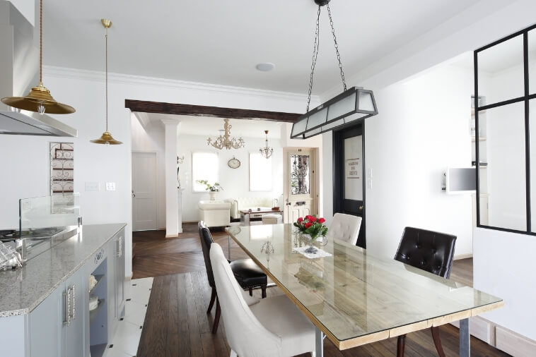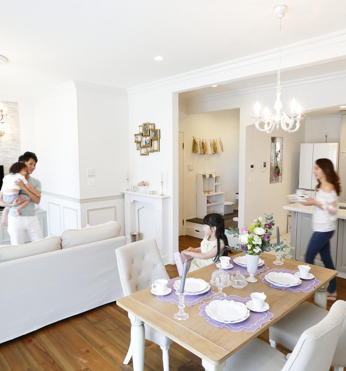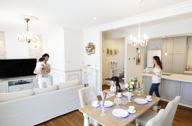 本場パリを彷彿とさせる住宅、その内装は、シャンデリアで彩られたリビング、エレガントな寝室、アンティーク調の家具やインテリアが目を引き、シャビーな空間を彩ります。