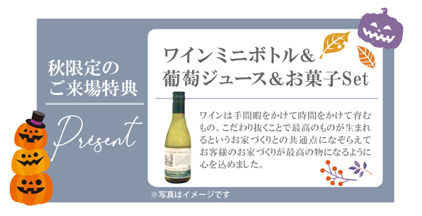 秋の装飾を纏ったプチパリエレガントスタイルのモデルホームを自然素材・全館空調の快適空間を体験しながらご見学ください