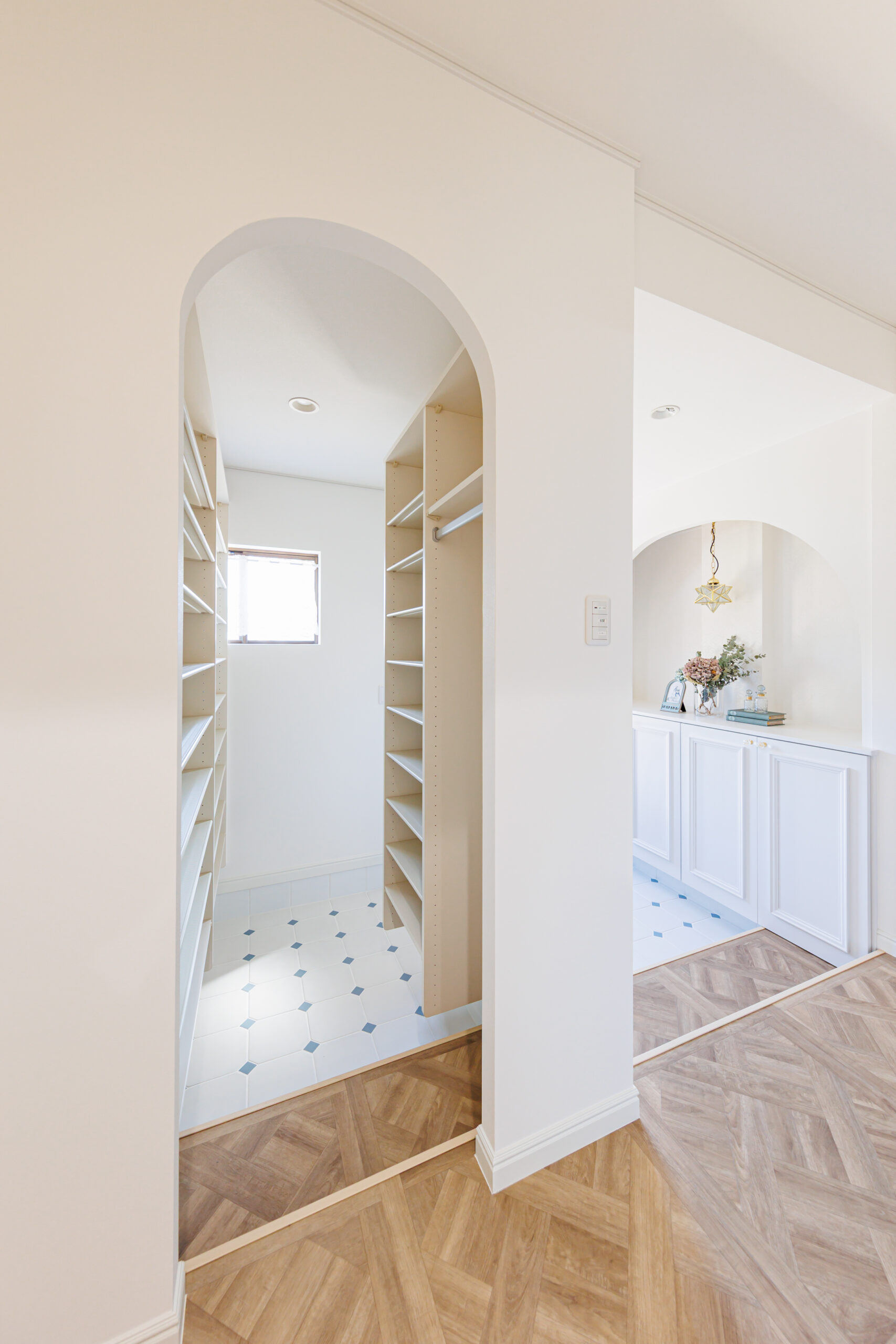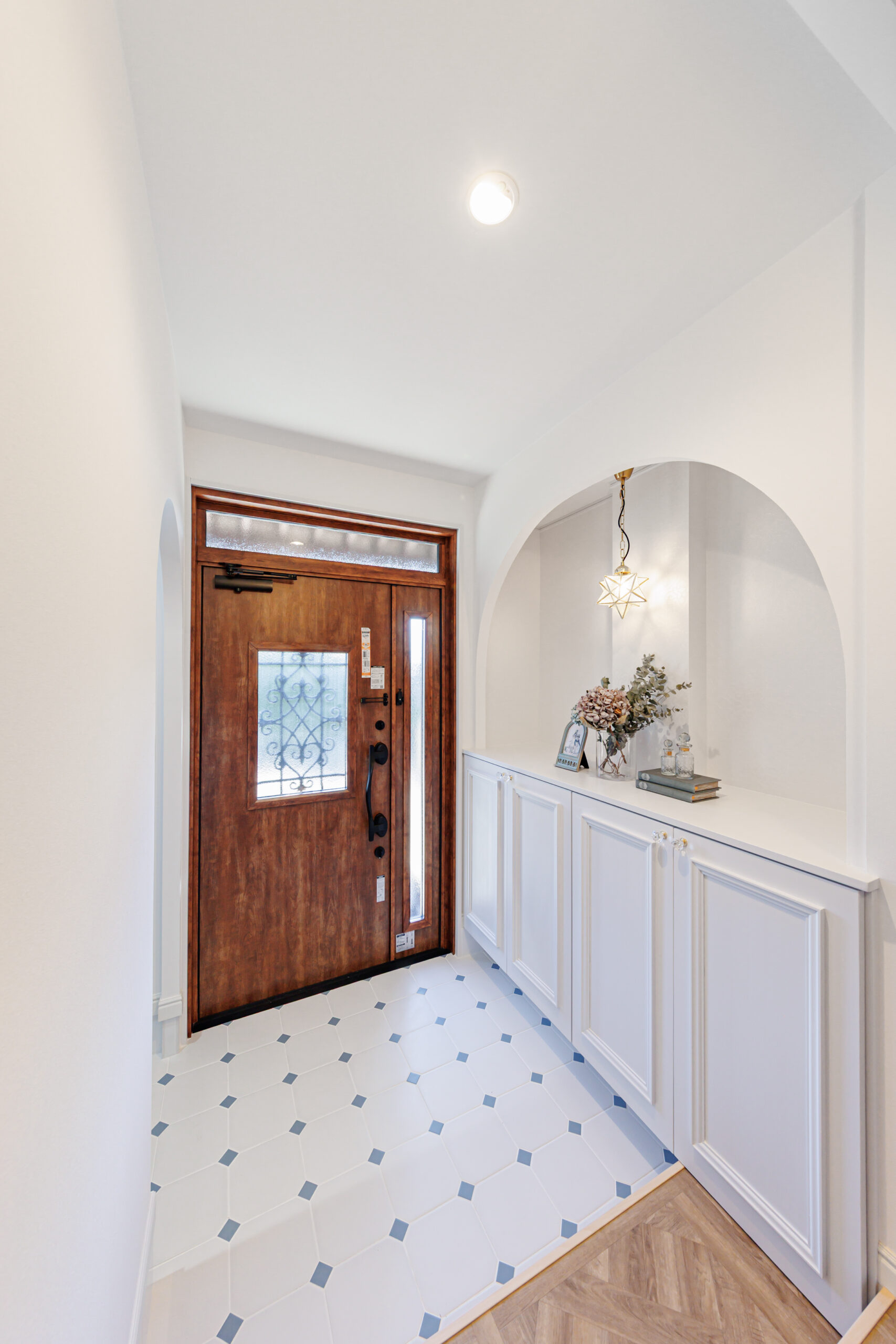 玄関ドアの取替で防犯面もUP下見違える玄関! オクタゴンドットのタイルがParisのエスプリを感じます♪ 白く広く収納たっぷりの明るい玄関に生まれ変わりました