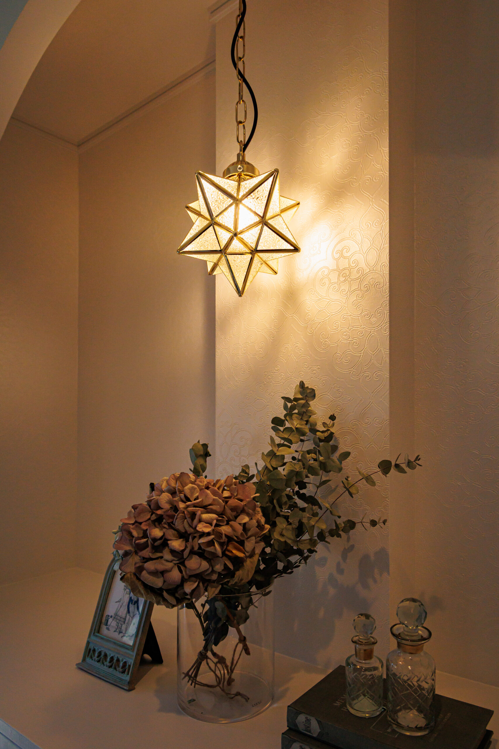 帰る人を迎える玄関には大きなニッチを設けお花屋季節のディスプレイで華やかに