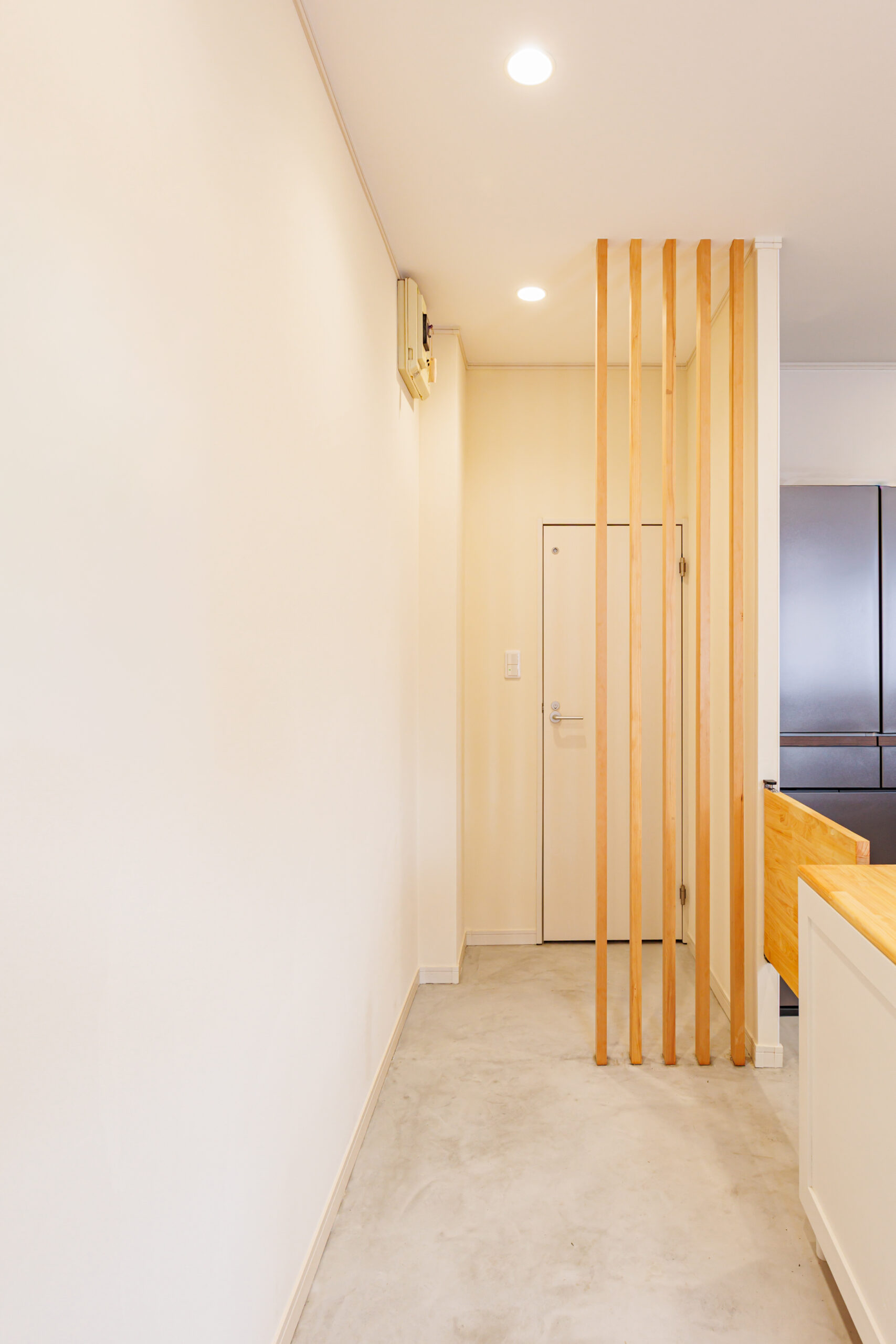 開放感のある白と木目のナチュラルで優しい空間に入口ドアの爽やかなブルーがよく映えます