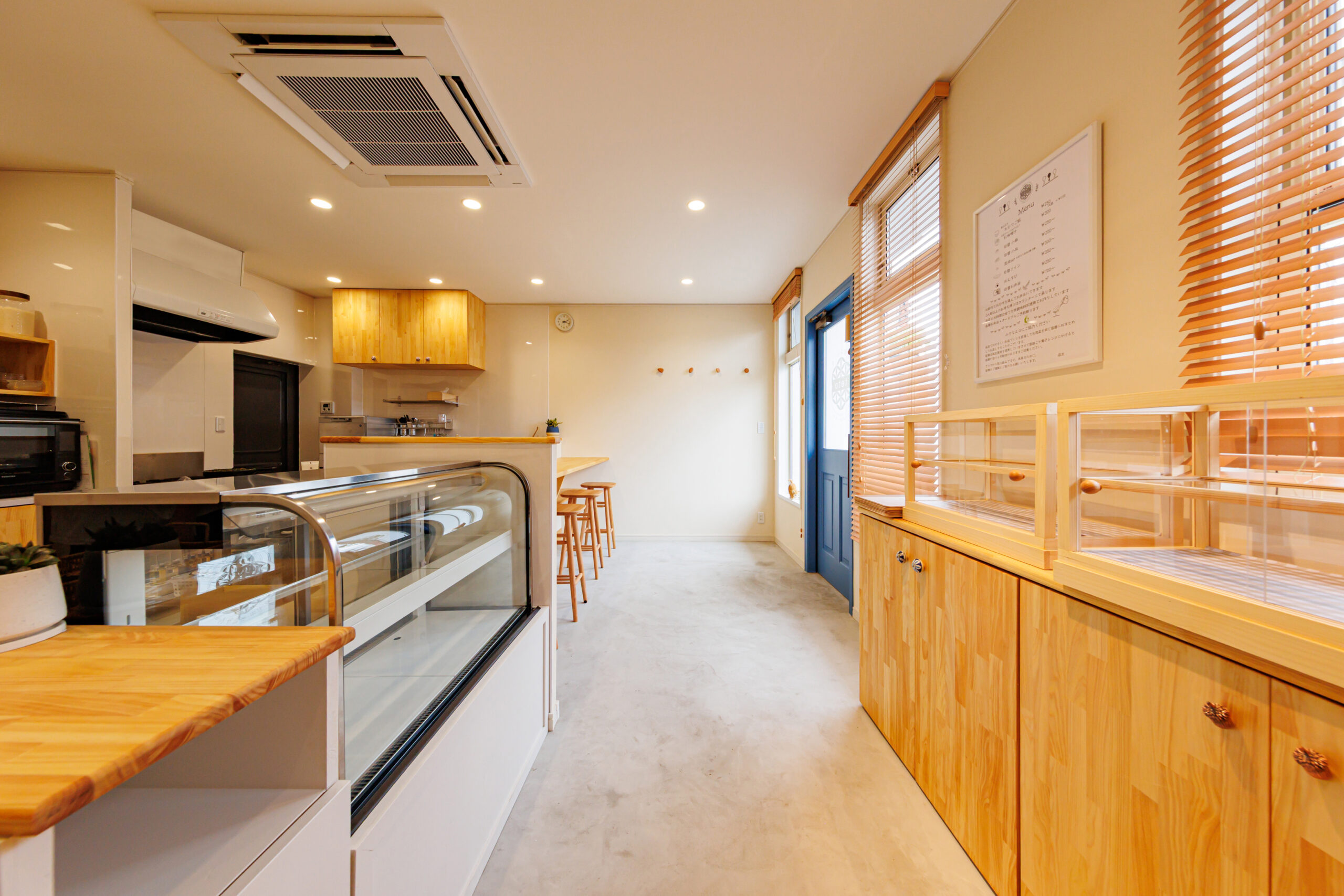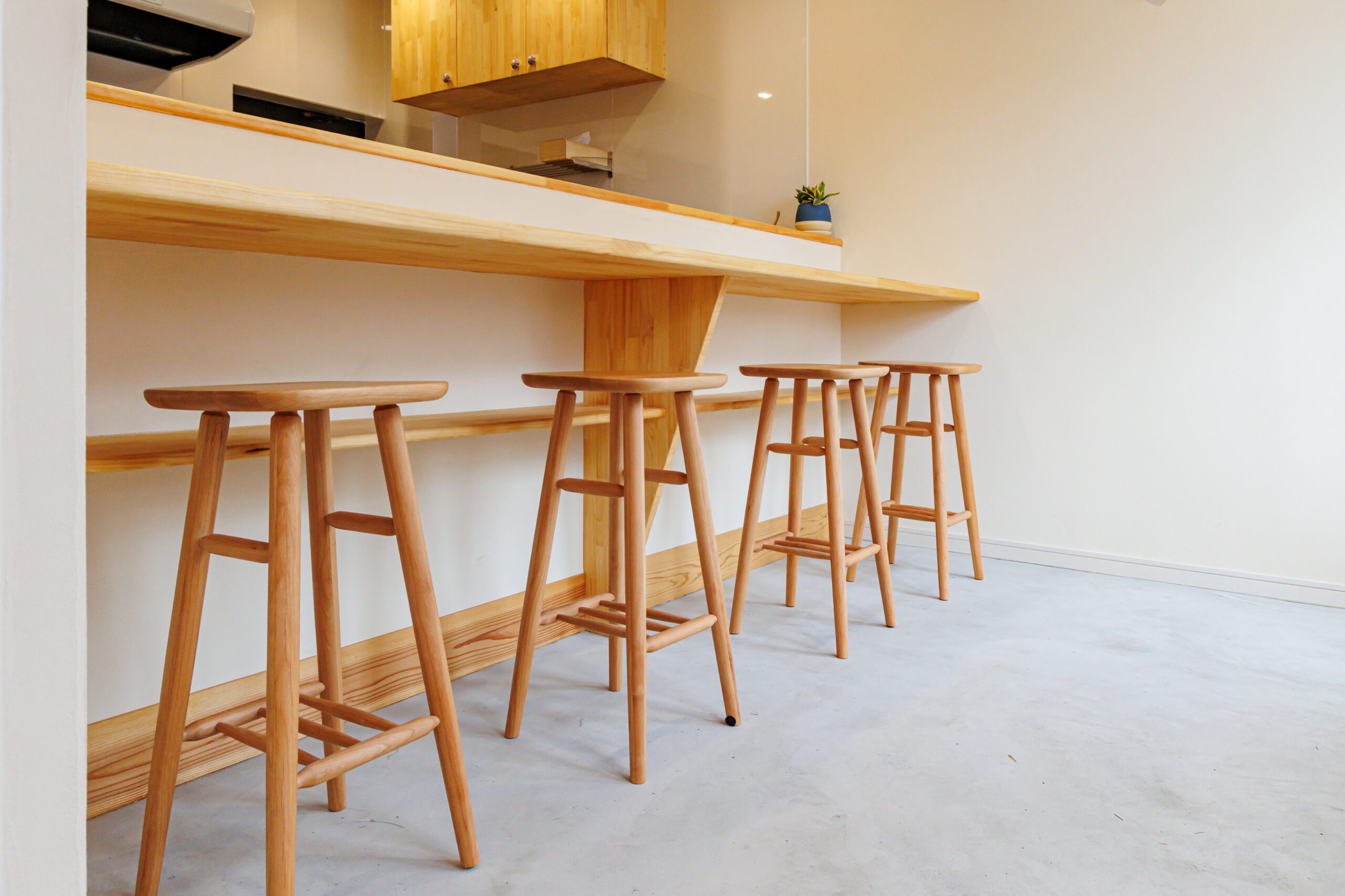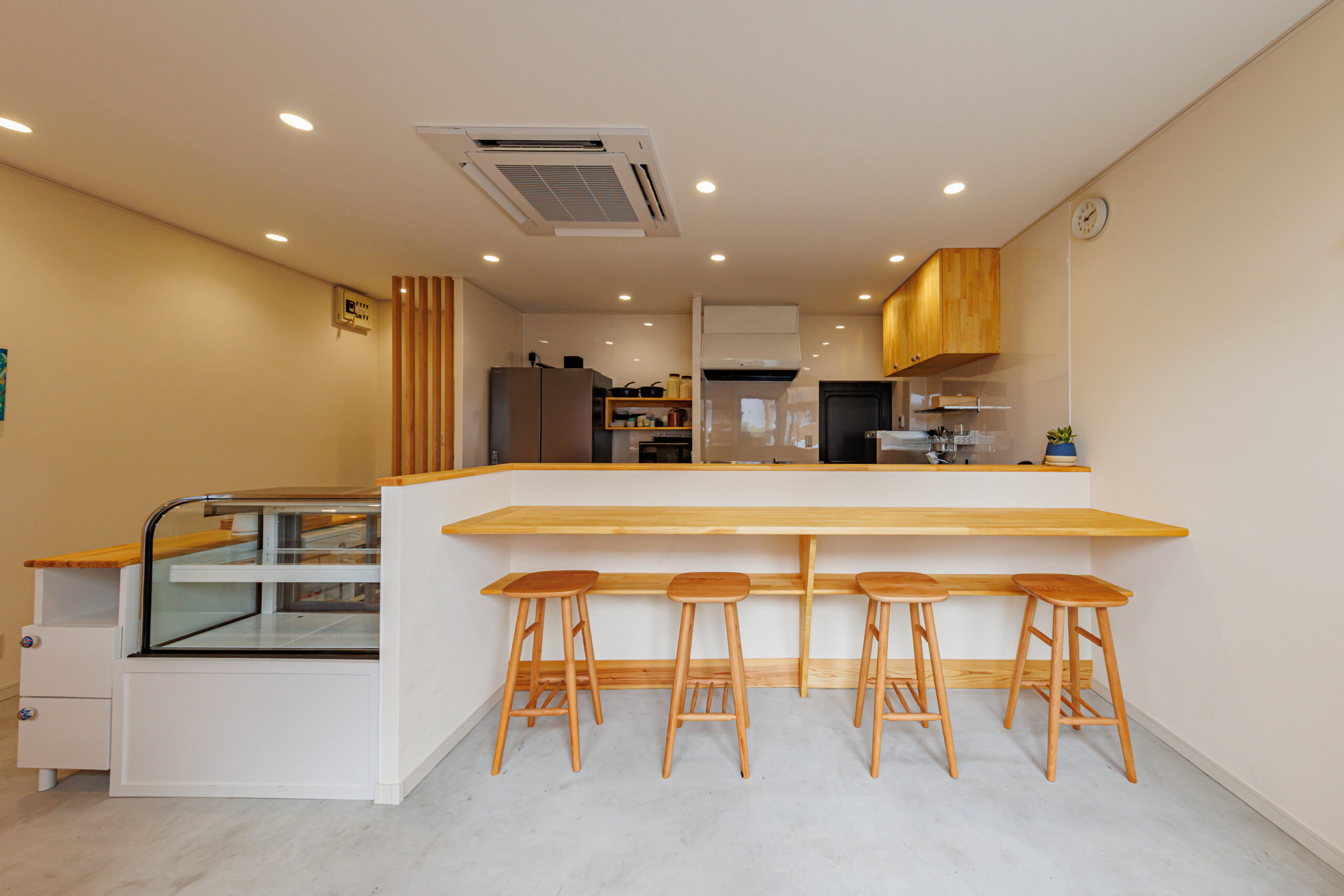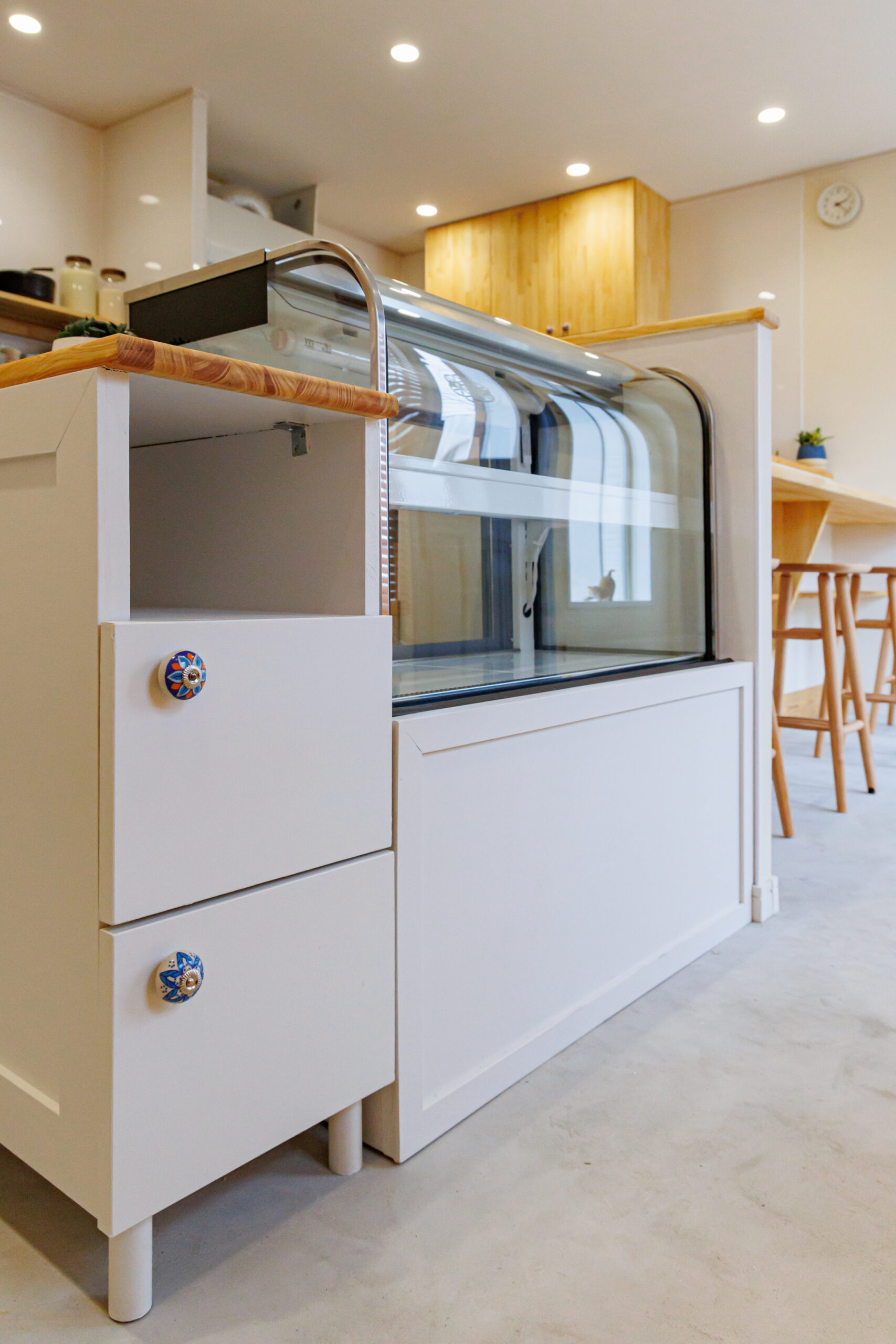テイクアウトもイートンもできるカウンターは高さや荷物置きなど細かなサイズを相談して丁寧に進めました